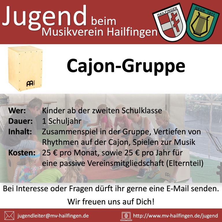 Inhalt: Zusammenspiel in der Gruppe, Vertiefen von Rhythmen auf der Cajon, Spielen zur Musik