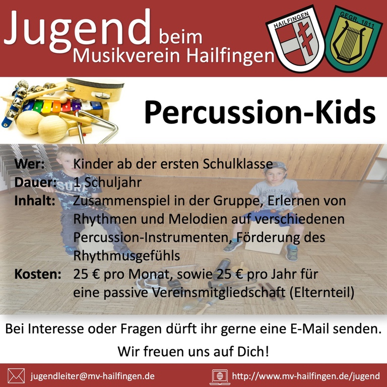 Inhalt: Zusammenspiel in der Gruppe, Erlernen von Rhythmen und Melodien auf verschiedenen Percussion-Instrumenten, Förderung des Rhythmusgefühls