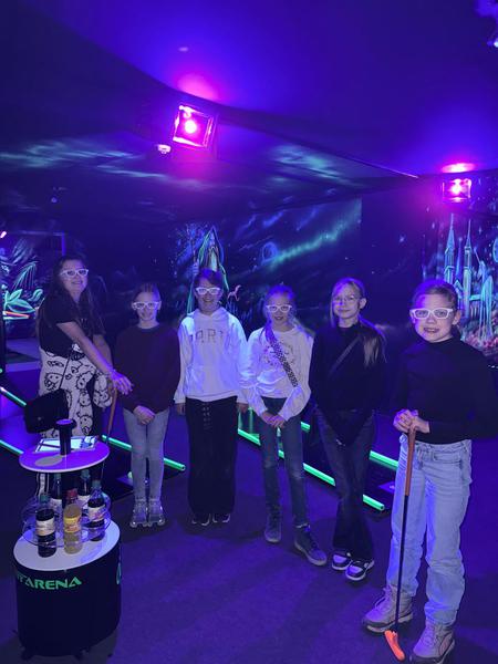 In kleinen Gruppen wurde am Mittag mit viel Spaß gespielt, gelacht und um Punkte gekämpft. Für viele Kinder war es das erste Minigolf-Erlebnis. Die besondere Atmosphäre mit Schwarzlicht und